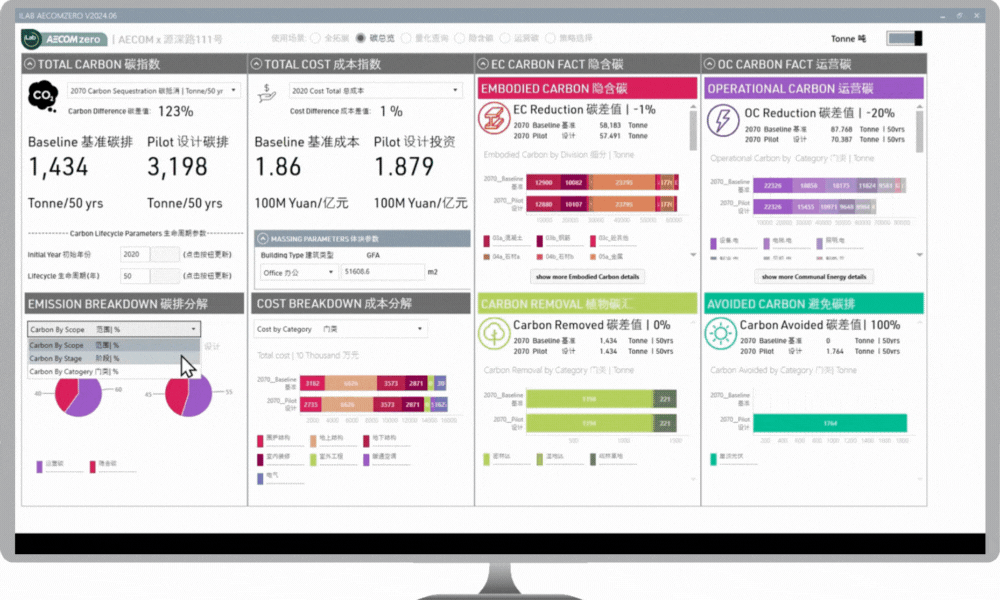 AECOMzero零碳路径研究与模拟工具:帮助团队在方案设计阶段即进行碳排放预测与控制,最大化建筑减碳水平;